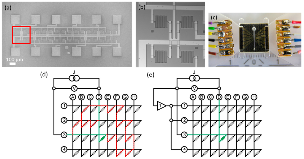 Lab-prototype of a “lab on a chip” device: (a) SEM image of the device heart consisting of 32 GMR sensors. The marked region of four meander shaped GMR sensors is shown enlarged in (b); (c) Photograph of the connected device; (d,e) illustrate the advantage of the guarding procedure for an analysis of a matrix of 32 sensors. Only the green labeled sensor element (line 3, column D) should be measured. Possible other paths of the current are marked in red; (d) the matrix without guarding; (e) when the guarding approach is applied.