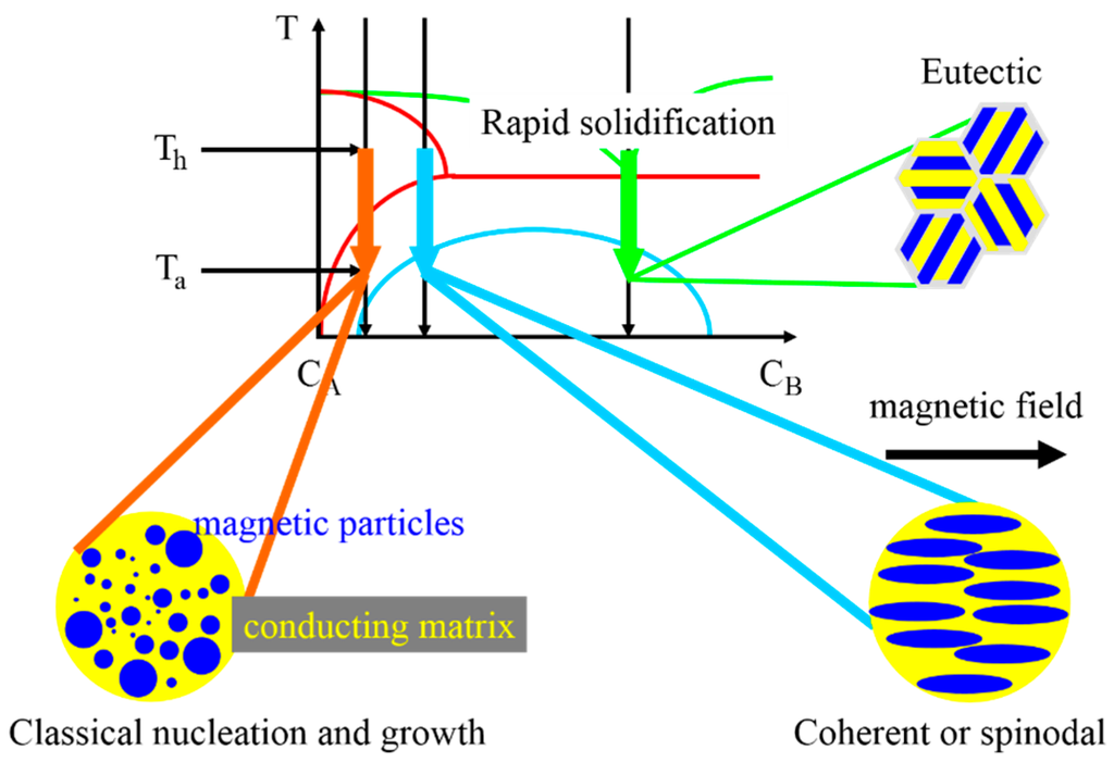 Four years after the discovery of the GMR effect in multilayer structures it was shown by Berkowitz et al. and Xiao et al. that GMR is not restricted to thin film systems, but occurs in heterogeneous bulk alloys, too [,]. Both groups utilized magnetron sputtering or melt spinning to create ferromagnetic Co precipitates in a non-magnetic Cu matrix, respectively. Underlying physical mechanisms which can induce the formation of such granular bulk GMR structures in alloys are summarized in the schematic phase diagram shown in Figure 13. Different decomposition types for the formation of magnetic precipitates (metal A) in non-magnetic matrix materials (metal B) have been observed: (1) decomposition by classical nucleation and growth, e.g., in Ag-Co systems [,,]; (2) coherent or spinodal decomposition, e.g., in Cu-Co systems [,] and (3) eutectic decomposition, e.g., in Au-Co alloys [,]. However, it is expected that Ag-Co and Cu-Co systems will behave as decomposed due to a large content of Co [].