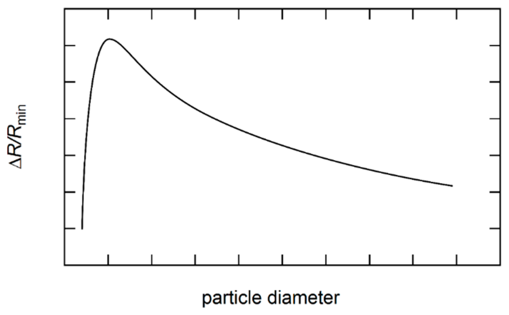A couple of models exist, which try to evaluate the parameter on a theoretical basis. Kim et al. [] proposed a model based on the Kubo formalism. They modeled the magnetic grains as centers for potential barriers. They found their model to be in agreement with data by Xiao, Jiang and Chien [], but as approaches 1, the GMR deviated from . Additionally, they examined the GMR dependence on grain size compared to experiments by Xiao et al. [] and Xiong et al. []. They found an optimal size for grains (compare Figure 14). The GMR effect rises rapidly until it reaches a maximum at the optimal grain size and then slowly decreases. They assumed this to be an effect of larger grains acting as conduction medium instead of only scattering centers.
