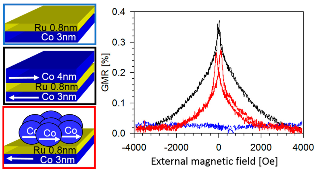 - Paul, A.; Damm, T.; Bürgler, D.E.; Stein, S.; Kohlstedt, H.; Grünberg, P. Correlation of magnetotransport and structure in sputtered Co/Cu multilayers. J. Phys. Condens. Matter 2003, 15, 2471–2491. [Google Scholar] [CrossRef]
