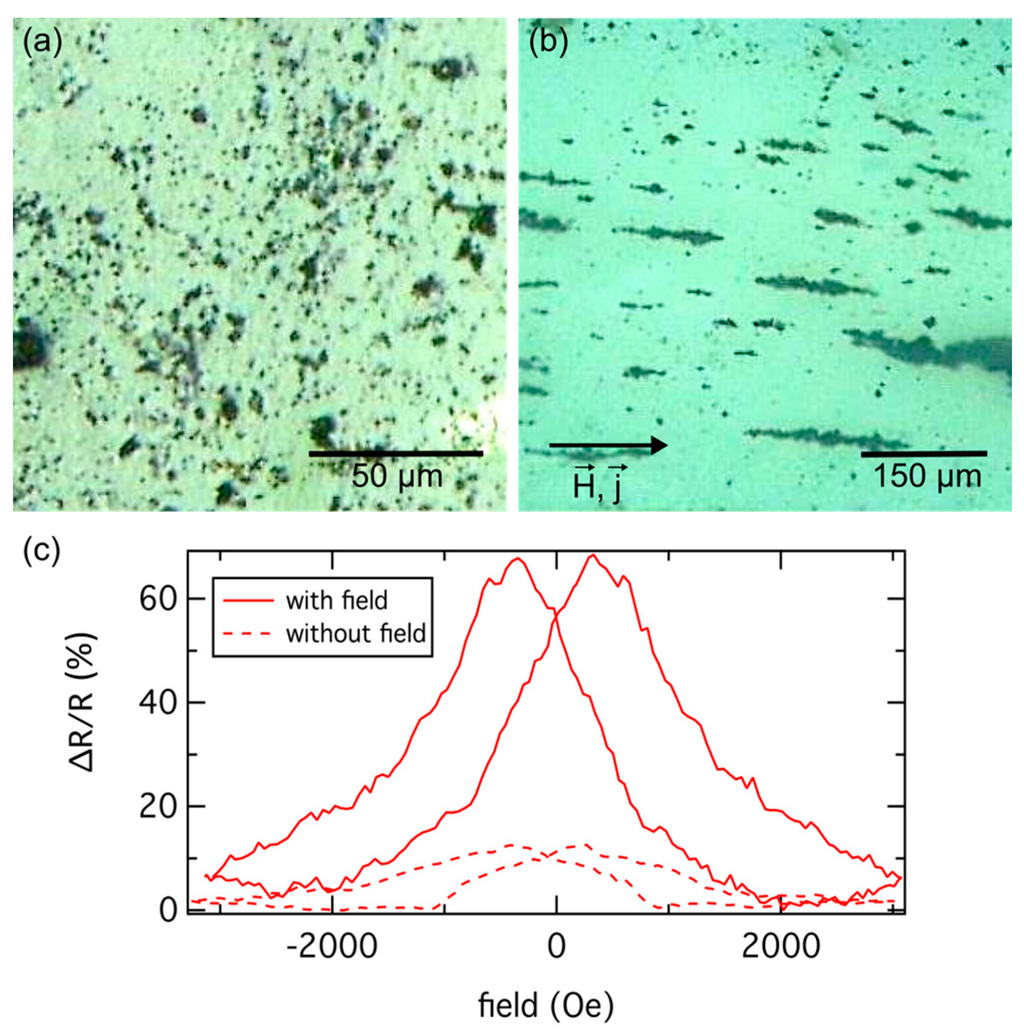 By applying an external magnetic field during the decomposition process (see Figure 13, case 2), elongated magnetic precipitates can be prepared. This has been demonstrated by Hütten et al. in AlNiCo5 bulk alloys []. It has been shown that the probability of spin scattering is two times higher, if the direction of the current is perpendicular to the direction of the particle elongation.