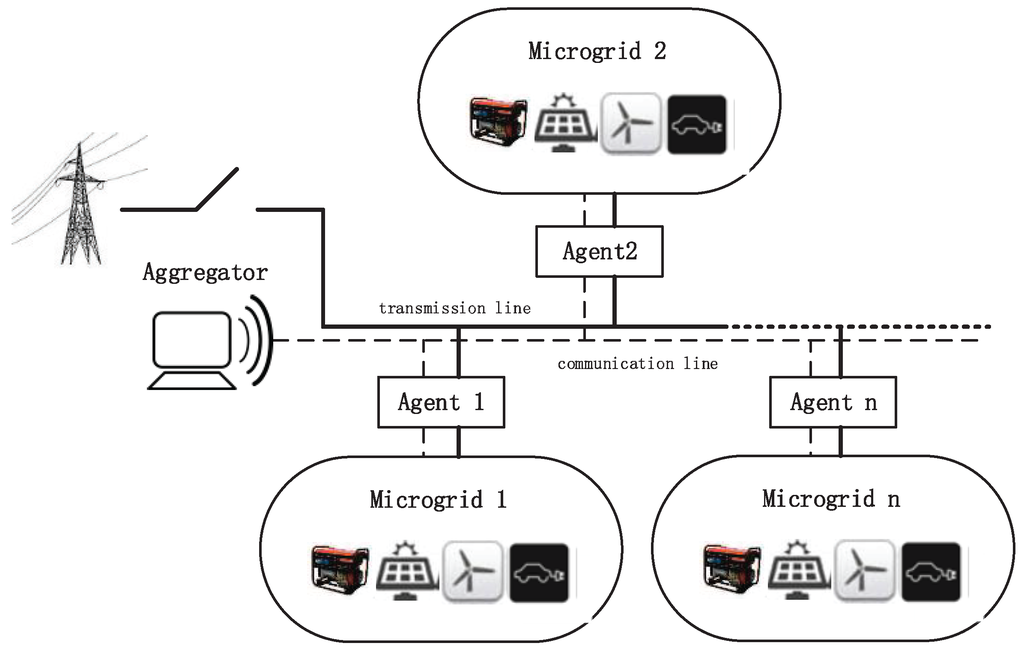 The physical components are comprised of local MGs, the interconnection transformer which ensures the power transmission among local MGs. In each MG, the diesel unit and various RES generation devices are used to produce the required energy. The installed capacity of all distributed generators will meet the load demand of each MG in order to avoid the occurrence of power outage. In addition, RES generators, which consist of solar panels and wind turbines, are integrated in each MG. The loads in MGs are divided into two types: EVs and non-EV loads. Through G2V (Grid-to-Vehicle) and V2G (Vehicle-to-Grid) technologies, the EVs can be managed to charge or discharge at different time slots according to the current power consumption, while the non-EV loads are unable to schedule.