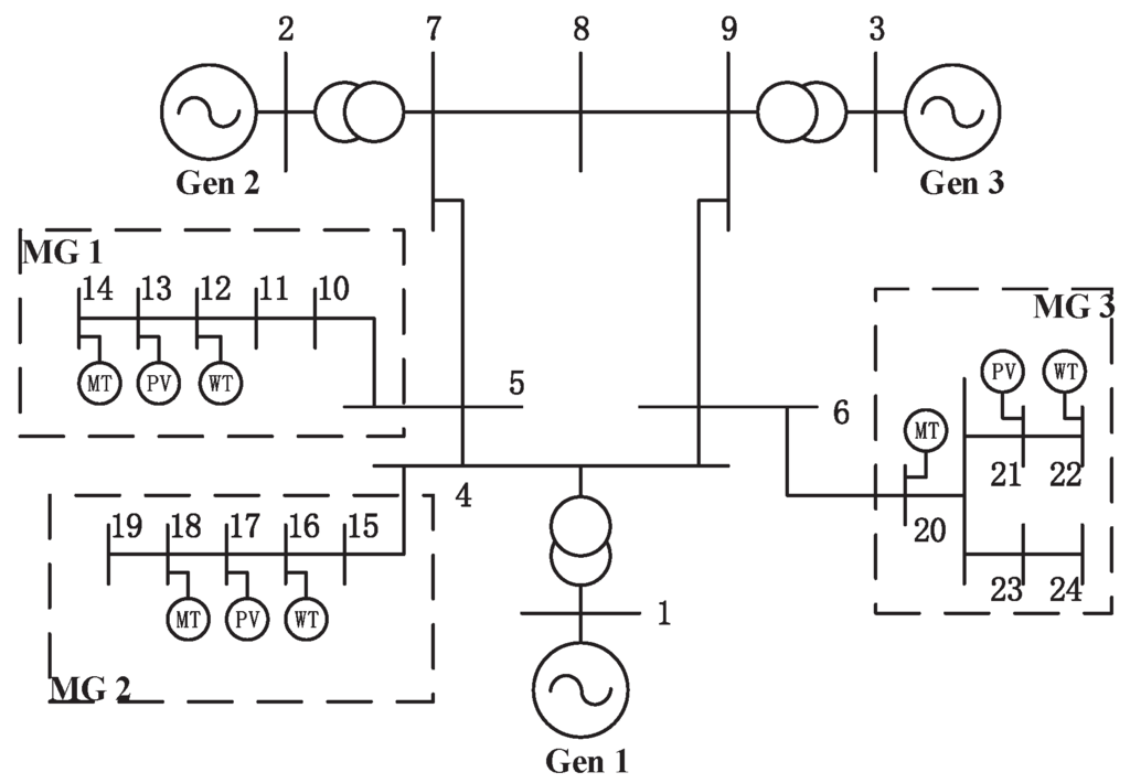 Because of the size difference of MGs, the maximum capacities of vehicles are different. According to Equation (7), there are approximately 100, 150, and 200 vehicles existing in , and . Based on the study in [6,16], it can be estimated that the average distance that each vehicle drives will be 32.88 miles per day and 17.89 kg CO will be produced. Thus, the emission cost of a CV is $0.25. The capacity of a lithium battery in EV is set to 10 kW. For the sake of simplicity, it is assumed that the EV will be installed with the lithium battery () for charging, and the minimum level for driving is 50%, meaning that each EV will discharge half of the battery to the power grid in order to reduce the supply pressure. In addition, the battery degradation factor is 0.03 and the power loss factor is 0.027, respectively. The line resistance of unit distance R is set to , and the transmission voltage V between two MGs is 35 kV. Finally, the entire scheduling period is divided into 24 intervals per day. The features of three MGs in our system are listed as follows: is with a lower load demand while with sufficient RESs, , is with a medium load demand level while with fewer RESs, and is with the largest load demand while with the least amount of RES integration.