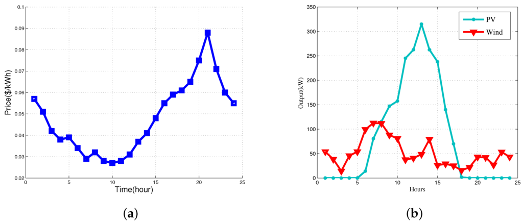 In this paper, we consider the parameters to capture uncertainties, wind, PV generation capacity and electricity prices. Notice that wind output power and solar outputs can be derived based on the wind speed, solar irradiance, and ambient temperature. Our prior work in [12] showed that the machine learning-based schemes (e.g., Support Vector Machine (SVM), etc.) could be used to predict the wind speed. These learning-based schemes can also be used to predict the electricity price. In addition, in our prior work in [19], we proposed a Kalman filter-based scheme to forecast sunshine hours and ambient temperature accurately, which are associated with PV generation. For the sake of simplicity, in this paper, we assume that the parameters associated with uncertainties are distributed independently. Figure 3a shows the prediction results of real time price in the archipelago microgrid. It can be seen that the electricity prices are low in 04:00–14:00, so that the consumers are more willing to charge their EVs at these time slots. During the time slots with high prices (16:00–24:00), a smaller number of EVs will be employed to charge. Figure 3b indicates the forecasted results of wind and solar generation, where the green and red curves are the generation output of solar and wind energy in 24 h a day, respectively.