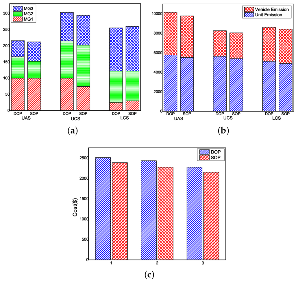 The different scheduling results of EV scale, by adopting three schemes in both the SOP and DOP models, are shown in Figure 4a. Recall that the surplus energy in MGs is utilized for EV charging to reduce the emission cost. It is worth noting that, although a large number of EVs are able to promote the energy efficiency of RESs and reduce the emissions cost, more EVs also signify a higher operation cost because of the frequent battery degradation and power transmission loss. To this end, it is critical to penetrate the rational number of EVs according to the three schemes of UAS, UCS and LCS.