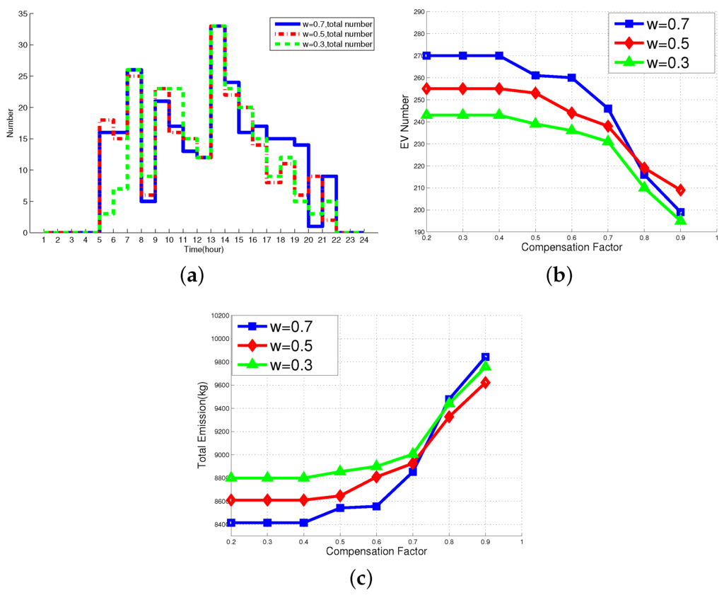Sensitivity analysis results of weighting factor and compensation factor. (a) EV scale vs. weighting factor; (b) EV scales vs. compensation factor; (c) emissions vs. compensation factor.