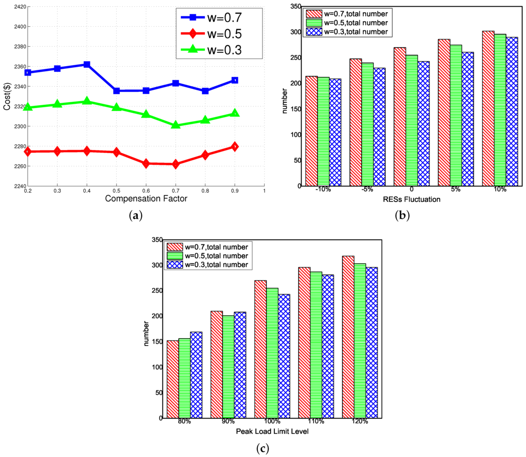 As the LCS is the most realistic and reasonable scheduling scheme in this paper, we have conducted a sensitivity study of key parameters, including weighting factor, compensation factor, renewable energy resources fluctuations, and peak load limits in the SOP model. The detailed results are shown below.