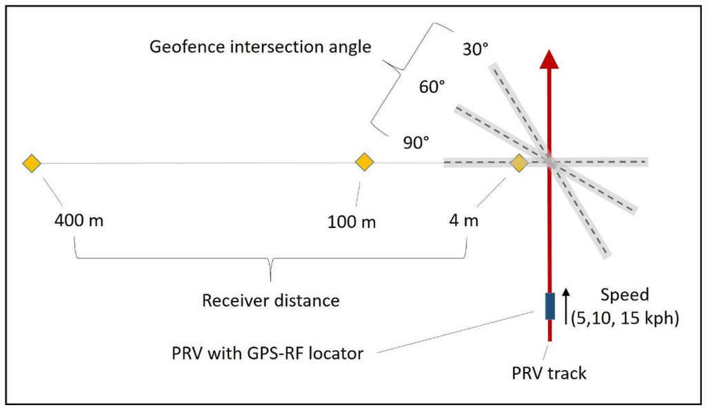 In order to quantify sources of variability in geofence crossing signals, a 3 × 3 × 3 factorial experiment was conducted in a clear area under open skies using a motorized portable recreational vehicle (PRV) designed to run on a wooden track at the University of Idaho Forest Operations Research Lab in Princeton, Idaho (46.916096°N–116.831736°W). The experiment was conducted in an open area in order to isolate factors of interest from the potential effects of forest canopy, which are being evaluated in a separate experiment. The recreational vehicle was a motorized cart elevated on a track constructed of pressure-treated structural lumber (3.81 cm × 13.97 cm). The cart was coupled to the track using angle irons with vertical and horizontal wheels, providing a smooth, straight course for evaluation of position, navigation and timing with minimal influence due to variability of the ground surface. The experiment had three levels of vehicle speed (5, 10, and 15 km/h), three levels of geofence intersection angle (30 degrees, 60 degrees, and 90 degrees), three levels of receiver distance perpendicular to the track (4 m, 100 m, and 400 m), and 3 replicates for a total of 81 trials. The track was 60.96 cm in width, and was leveled to less than 10 cm height difference along the 120 m length used for the experiment. It was aligned on the magnetic East/West axis using a total station. The track was flagged at 10 m increments. A WAAS-enabled GNSS-RF transmitter (TT 15, Garmin, United States) was attached via its collar to the front bumper of the PRV, centered on both the bumper and the track approximately 15 cm above the track. The handheld receiver with extended antenna (Alpha 100, Garmin, United States) was attached via a cardboard holder and zip-ties at a height of 1.58 m to a PVC pole driven into the ground at a set 5 m distance perpendicular to the 80 m point along the track, as measured by a total station. The receiver and transmitter were separated only by unobstructed flat land to avoid signal interruptions or reroutes that could affect the transmission times. The geofence was centered on the track at 80 m, and geofence angles were sighted using a total station []. For each angle, the end points of the geofence were set to 20 m from the track (Figure 1). Because the Garmin Alpha handheld unit requires polygonal or radius geofences, and not lines, the extraneous points were set 20 m out, 10 m before the start of the track. Points were added to the geofence in the receiver as an average of three waypoints at each location. A calibrated speedometer was mounted to the PRV to provide speed feedback to the driver and was validated through hand timing.