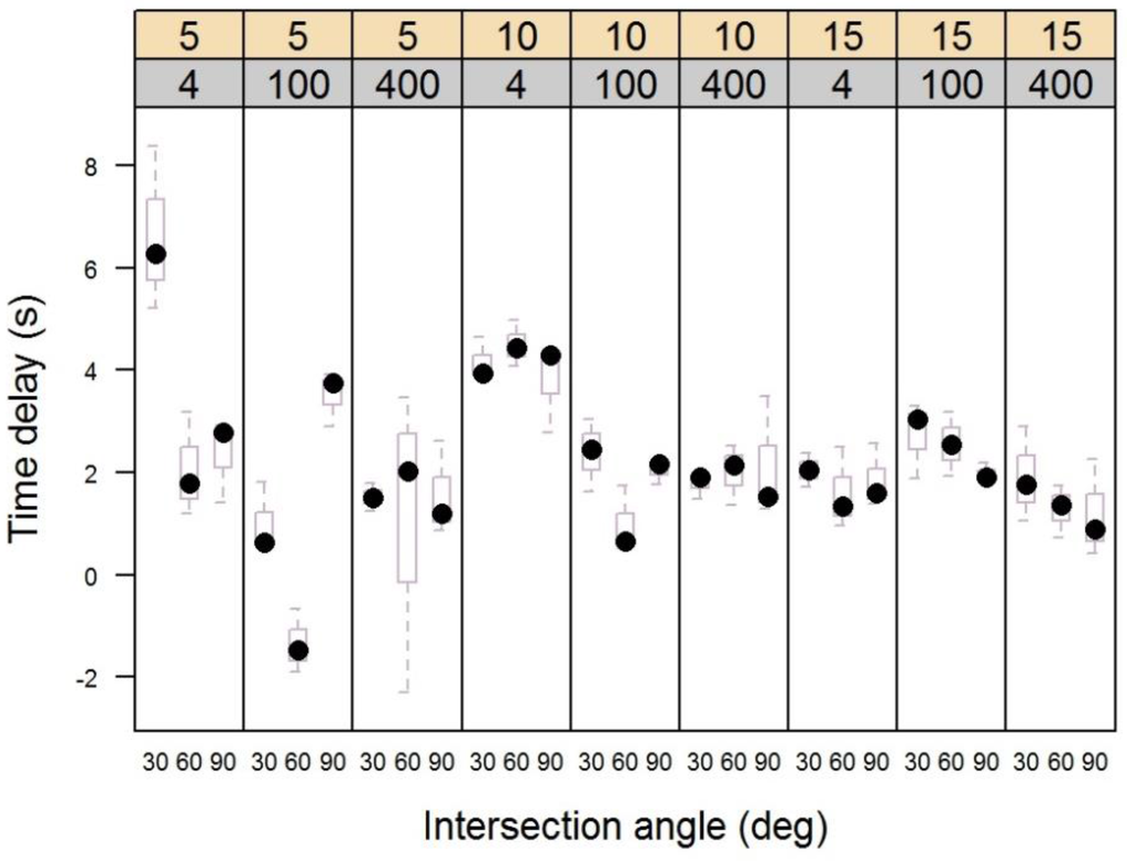 Figure 2 shows that across all treatments, the total range of delay times varied inversely with speed, declining for the 5 kph, 10 kph, and 15 kph treatments (10.7 s, 4.47 s, and 2.9 s, respectively). Thus, as the vehicle and position locator moved more quickly, error in the geofence crossing signal was reduced rather than increased. The 30 degree intersection angle had the highest median delay for 5 of the 9 speed and receiver distance treatment combinations, followed by the 60 degree angle for 3 of the remaining. The 90 degree angle median delay was highest for only one treatment combination.