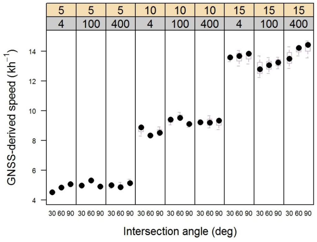 Box-and-whiskers plot showing the distribution of GNSS-based cart speeds for all trials in the experiment. Upper panel numbers are speed (5 kph, 10 kph, 15 kph). Sub-panel scale is receiver distance (4 m, 100 m, 400 m).