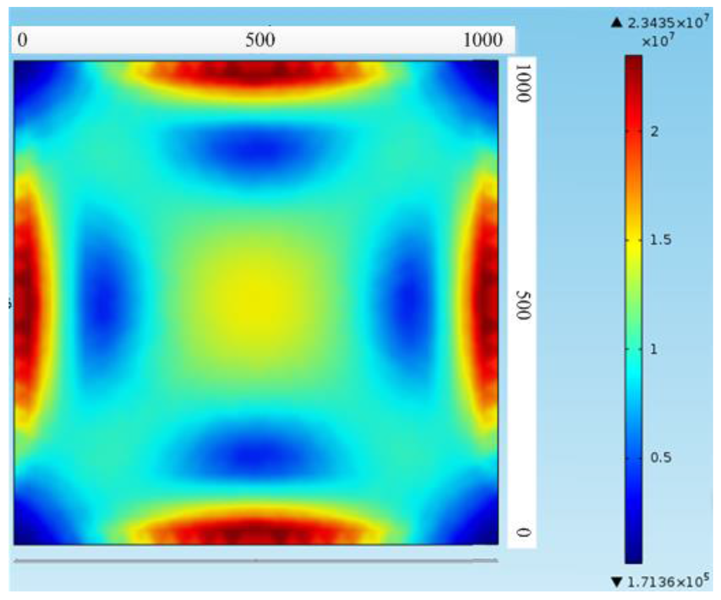 where the piezoresistive coefficient π44 = 138 × 1011 Pa−1, Young’s modulus E = 190 GPa, Poisson’s ratio v = 0.28. When the pressure sensor range P = 2 MPa, pressure can be calculated from the equation set for a reasonable range of a/h from 22 to 28. For the side length of 2 mm of the pressure-sensitive chip, the thickness of the diaphragm can be set to 40 μm for a sensitive diaphragm side length of 1 mm.