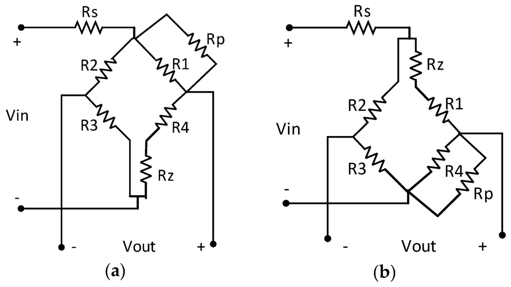This design of the pressure-sensitive chip temperature compensation circuit uses a passive resistor temperature compensation model based on hardware compensation of low-temperature-coefficient resistor networks, as shown in Figure 7. The bridge circuit is powered by a constant voltage source Vin, with passive compensation resistors Rs, Rp, and Rz. The premise of the model is that the temperature coefficient of the passive resistor should be less than 1% of that of the bridge arm resistor. In this case, the temperature coefficient of the passive resistor can be ignored. Because the temperature coefficient of a typical silicon piezoresistor is greater than 2000 ppm [16], the temperature coefficient of the passive resistor should be less than 200 ppm.