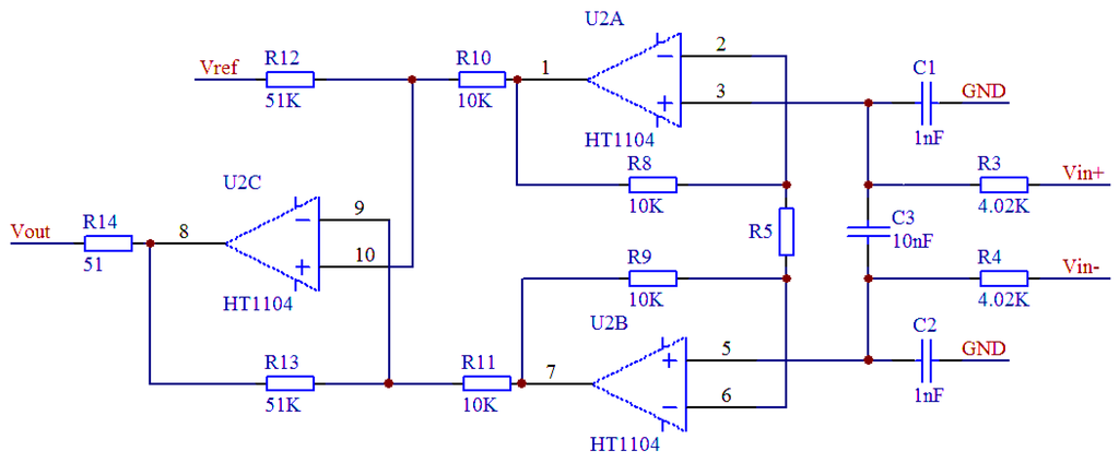 Vref for DC bias voltage of the output amplified signal can be obtained by linear regulator output voltage division. R5 (the gain adjustment resistor) determines the output voltage of the high-temperature signal-conditioning circuit, which can be expressed as: