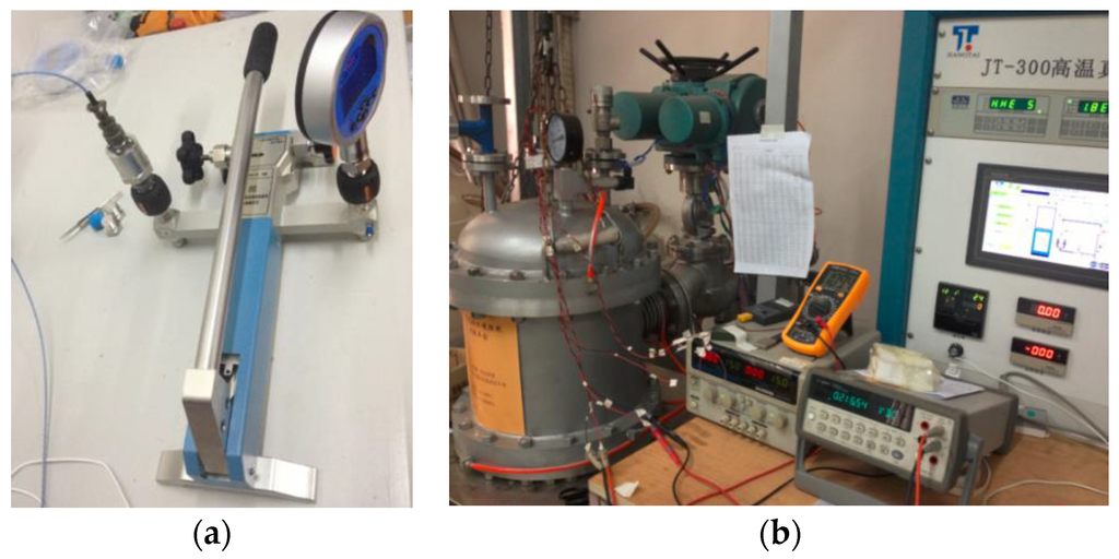 Calibration devices for pressure sensors: (a) pressure calibration device at room temperature; (b) high-temperature and pressure calibration device.