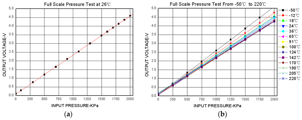 Pressure sensor calibration test results: (a) full scale pressure test at 26 °C; (b) full scale pressure test from −50 °C to 220 °C.