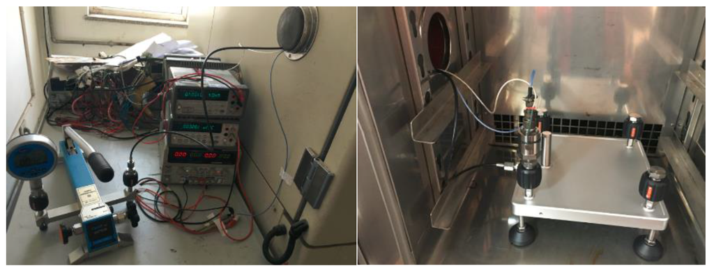 The measurement parameters of the high-temperature piezoresistive pressure sensor with integrated signal-conditioning circuit, have a range of 2 MPa and can be tested using the calibration devices shown in Figure 13; the test results are shown in Figure 14.
