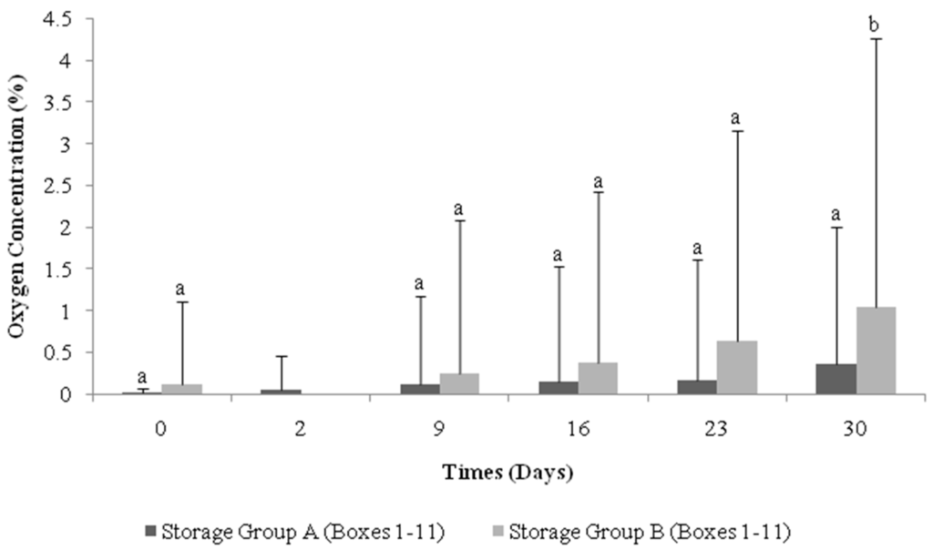 Profile of the mean oxygen content of each storage treatment Group (A—not distributed and B—distributed) assessed over 30 days. A significant difference (P ≤ 0.05) between storage groups on each day is indicated using lowercase lettering (a,b).