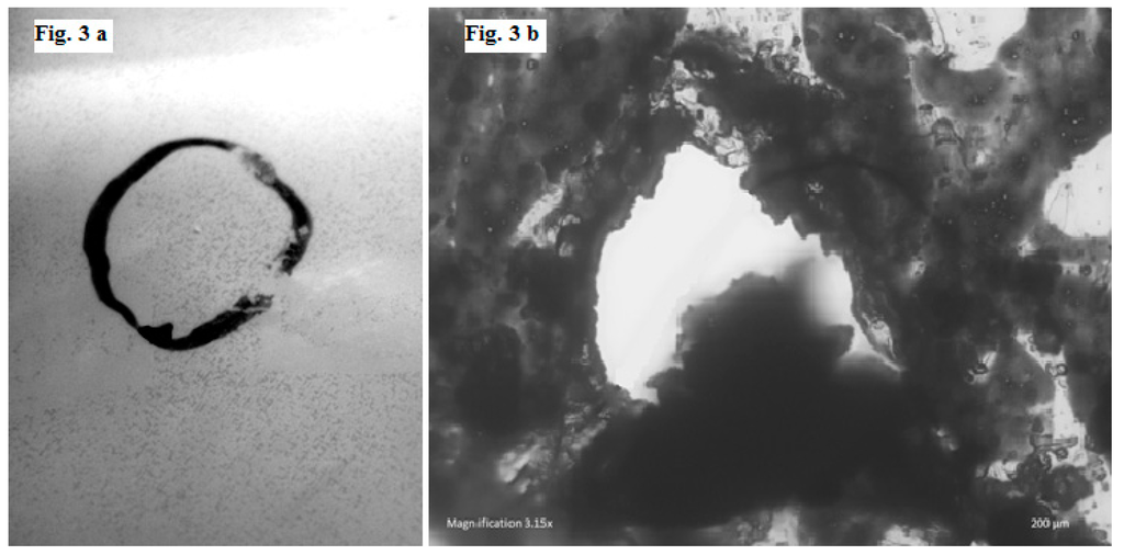 Marked location of the pinhole identified (a) and image of pinhole magnified using a light microscope (b).