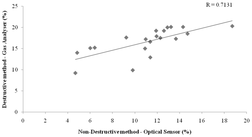 Relationship between oxygen measurement methods (destructive and non-destructive) and their correlation coefficient value (R).