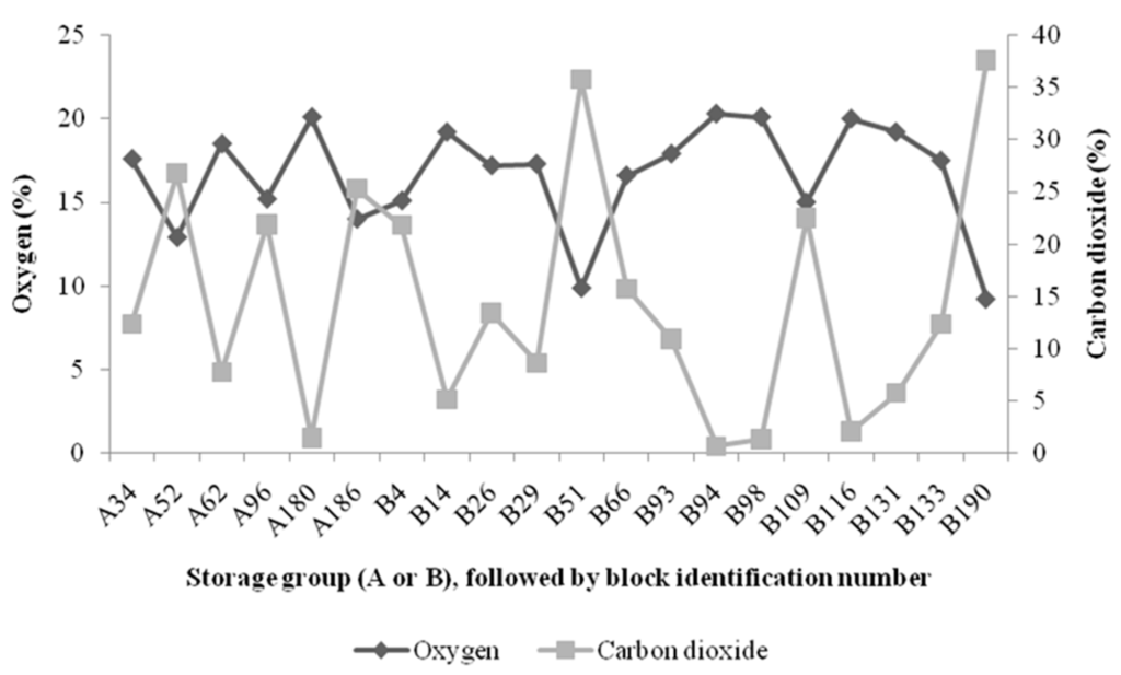 Comparison of carbon dioxide and oxygen readings of failed cheese blocks from storage Groups A and B.