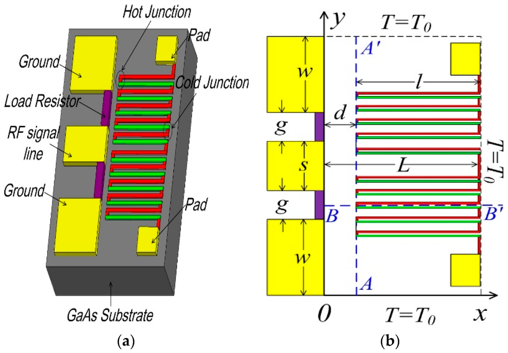 Figure 1a gives the schematic overview of the thermoelectric microwave power sensor by micro-electro-mechanical system (MEMS) technology. The microwave power is fed by a coplanar waveguide (CPW) transmission line and dissipated by two load resistors. The produced heat transfers in the substrate and is measured by DC voltage based on the Seebeck effect. Figure 1b shows the dimension parameters of the power sensor in the 3D model.