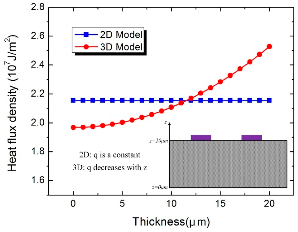 where q is the heat flux density, z is the coordinate in the thickness direction of the substrate, and a and b are coefficient, respectively. In this model, a = 3.125 × 103, and b = 2 × 107. Figure 2 shows the heat flux density of the power sensor in the thickness direction of the substrate. As can be observed, the heat flux density decreases from 2.5 × 107 J/m2 at the upper surface to 2.0 × 107 J/m2 at the lower surface of the substrate.