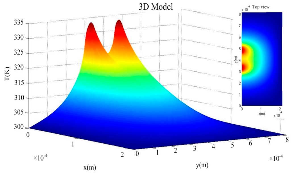 Based on the parameters in Table 1, the Matlab software is used to draw the calculated temperature distribution of the power sensor from the 3D model under 100 mW. As shown in Figure 3, two peaks of the temperature are up to 335 K and appear in the center position of the load resistors.