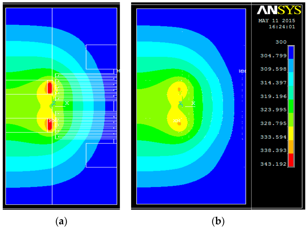In order to verify the proposed 3D model, ANSYS software is applied to simulate the temperature distribution. The parameters of the power sensor equal to those in the model, as shown in Table 1. The mesh size of the substrate is 10 µm, the mesh size of the CPW transmission line and the load resistors are both 3 µm, and the mesh size of the thermopile is 3 µm. The ambient temperature is assumed to be 300 K and the boundary condition of the finite element method (FEM) model is that the temperature of the top face, bottom face, and right face equals to 300 K. The results are shown in Figure 4. Identical to the 3D model, the two load resistors have the highest temperature at 343 K. The produced heat transfers around in the substrate, and the temperature is mainly determined by the distance to the heated resistors.
