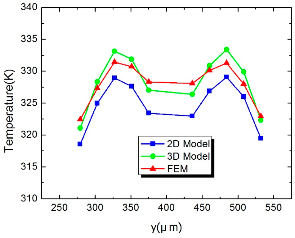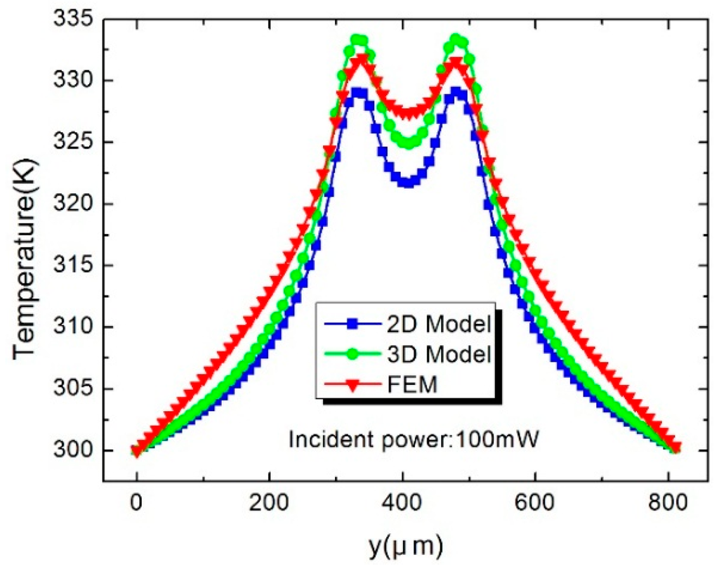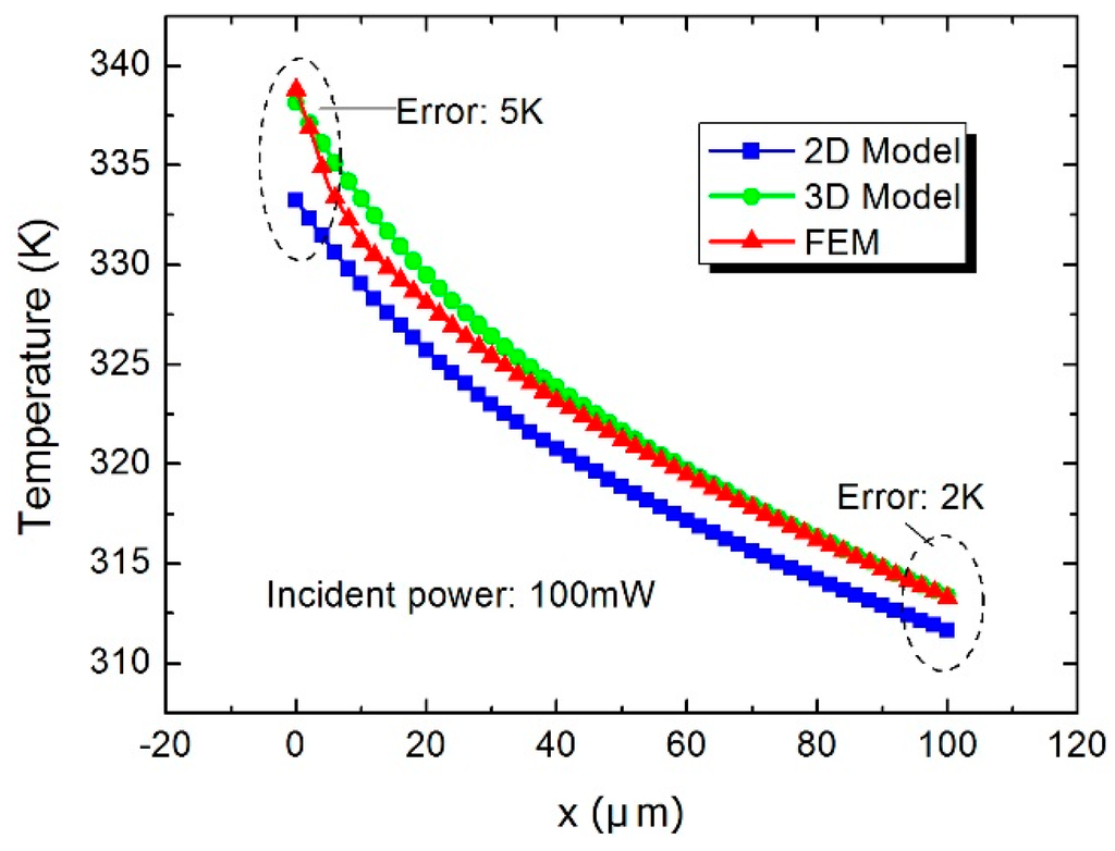 Figure 5 shows the temperature distribution (AA′ in Figure 1b) of the hot junctions in the thermopiles. Compared with the simulated results, the maximum temperature error of the 3D model is about 2.5 K, while it is up to 5.7 K in the 2D model. Figure 6 shows the temperature distribution (BB′ in Figure 1b) from the center of the load resistor to the cold junction of the thermopile. It demonstrates that temperature in the 3D model is higher than that in the 2D model, which is closer to the FEM results. The reason is that the heat flux density on the upper surface is higher than the average density in the 2D model. Figure 7 shows the temperature of the hot junctions of the ten thermocouples in the power sensors. As can be observed, the maximum error between the 3D model and the FEM results is about 2 K, while the 2D model is up to 5 K.