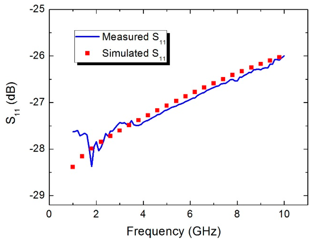 The microwave performance of the fabricated sensor is tested by a network analyzer together with the microwave probing station. As shown in Figure 10, the measured S11 of the proposed power sensor is about −27.5 dB at 1 GHz, −27 dB at 5 GHz, and −26 dB at 10 GHz. The simulated result by High Frequency Structure Simulator (HFSS) software is also given in Figure 10. Clearly, a good agreement is obtained, demonstrating that the fabricated power sensor has good microwave performance over the frequency band of 1–10 GHz.