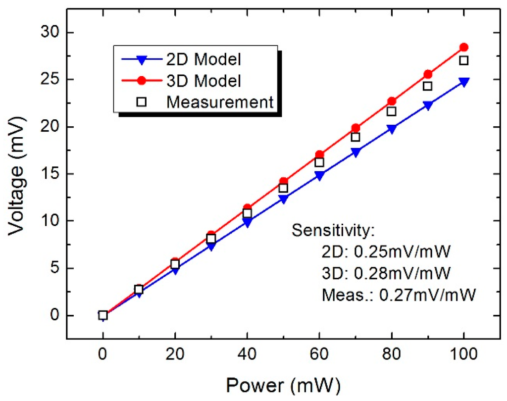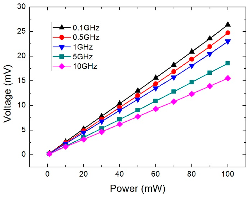 The microwave power measurement is performed using the analog signal generator, voltmeter, and microwave probing station. Figure 11 records the measured voltage as a function of the incident microwave power (DC power) from 1 mW to 100 mW. The output voltage increases from 0 mV to about 27 mV, and the sensitivity is close to 0.27 mV/mW. Meanwhile, the calculated results from the 2D and 3D model are also plotted in Figure 11. The sensitivity is close to 0.25 mV/mW and 0.28 mV/mW, respectively. As can be observed, the related error has been reduced from 7.5% of the 2D model to 3.7% of the 3D model. Figure 12 records the measured voltage as a function of the incident power at 0.1 GHz, 0.5 GHz, 1 GHz, 5 GHz, and 10 GHz, respectively. As can be observed, a linear relationship is obtained. Meanwhile, the sensitivity of the power sensor decreases with the frequency of the signal.