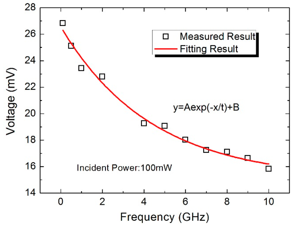 Figure 13 shows the measured voltage as a function of the frequency from 0.1 GHz to 10 GHz under the incident power of 100 mW. Clearly, the voltage decreases with the frequency of the signal, and a fitting curve is given. The voltage reduction in the power sensor is caused by a conductor loss and the dielectric loss of the transmission lines [11,12]. The loss from the signal generator to load resistors is caused by three parts: the coaxial line loss, the microwave probe loss, and the CPW transmission line loss. The coaxial line is about 1-m-long and plays an important role in the frequency loss. The high frequency will result in much loss in the transmission line. Therefore, the power reached to the load resistors decreases with the frequency. In addition, the parasitic loss of the load resistors also has an effect on the output DC voltage of the thermoelectric power sensor. The response time of this power sensor is close to 5 ms.