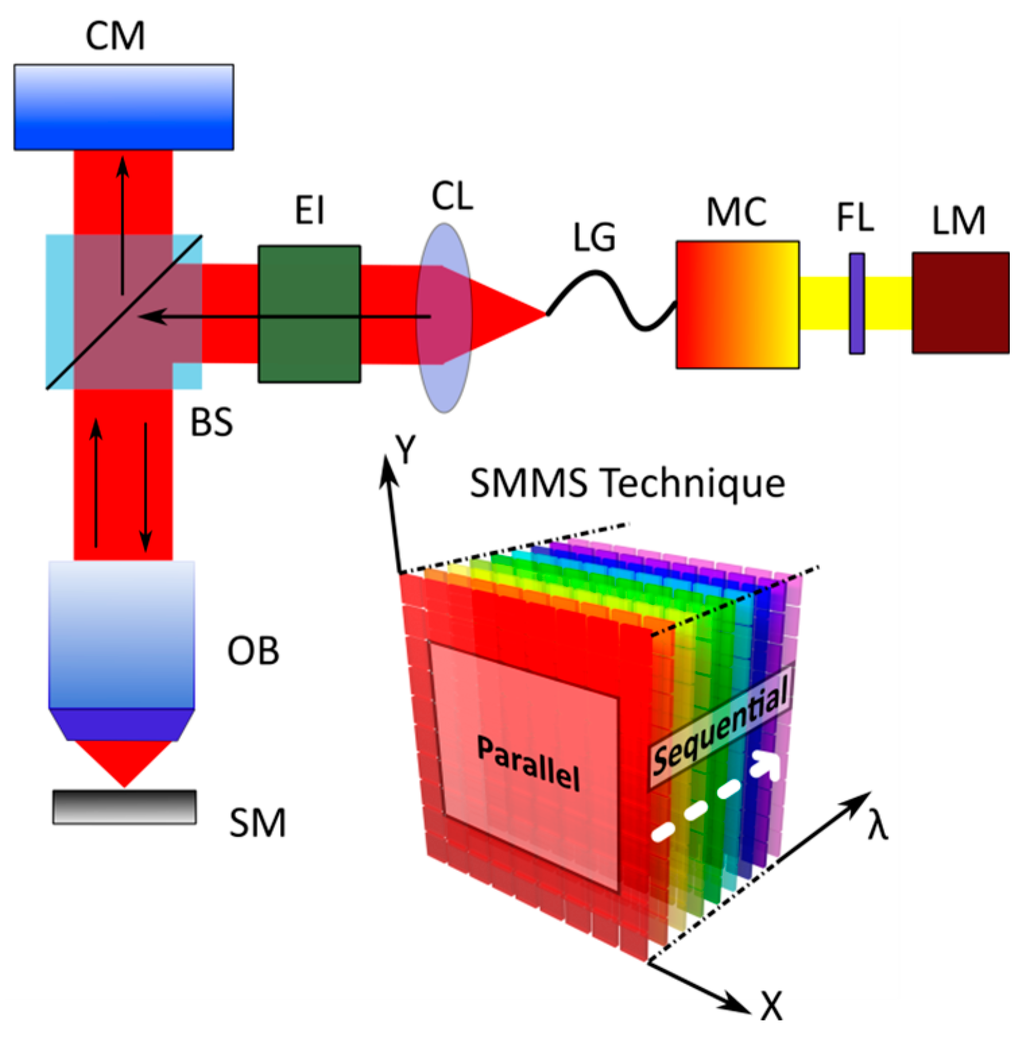 The spectral characterization of the reflected light by a sample needs the acquisition of a tridimensional data set known in literature as a spectral cube; the first two coordinates X and Y of the spectral cube correspond to the sample surface while the third coordinate λ represents the light wavelength. In standard micro-spectrophotometers, the spectral analysis of a single point on the sample surface is acquired in a one-shot measurement, while the spatial mapping is performed by sequentially scanning point-by-point the sample surface. Micro-spectrophotometers are thus parallel in the spectral coordinate λ and sequential in the spatial coordinates X and Y. The SMMS technique described here performs one shot measurement of the reflected light coming from an extended sample area at each fixed wavelength, and sweeps sequentially over the desired range of wavelengths. Thus, as shown in the schematic drawing of Figure 1, the SMMS technique is parallel in the spatial coordinates (X,Y), whereas it is sequential in the spectral analysis (λ).
