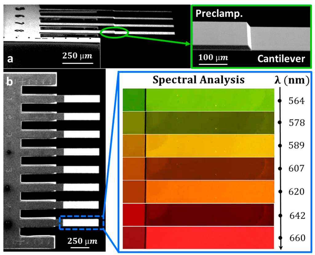 Bright-field images of a cantilever, with nominal thickness of 1 µm, and its pre-clamping, with nominal thickness of 6 µm, obtained at different wavelengths λ of the visible spectrum are shown in Figure 2b (blue box). The cantilever shows notable differences in reflectivity depending on the selected wavelength λ with multiple maxima (564 nm, 589 nm, 620 nm, 660 nm) and minima (578 nm, 607 nm, 642 nm) in the visible spectral range. This reflectivity modulation, known as Fabry-Perot interference, occurs because light can efficiently bounce multiple times between the opposite sides of a thin microcantilever [29,30,31]. At certain wavelengths, reflectivity is enhanced because these multiple reflections inside the microstructure generate constructive interference. Conversely, the reflectivity is suppressed for other wavelengths by destructive interference. At the pre-clamping region, this reflectivity modulation is negligible due to the absorption of silicon in the visible spectral range that avoids multiple reflections inside a thicker structure (6 μm).