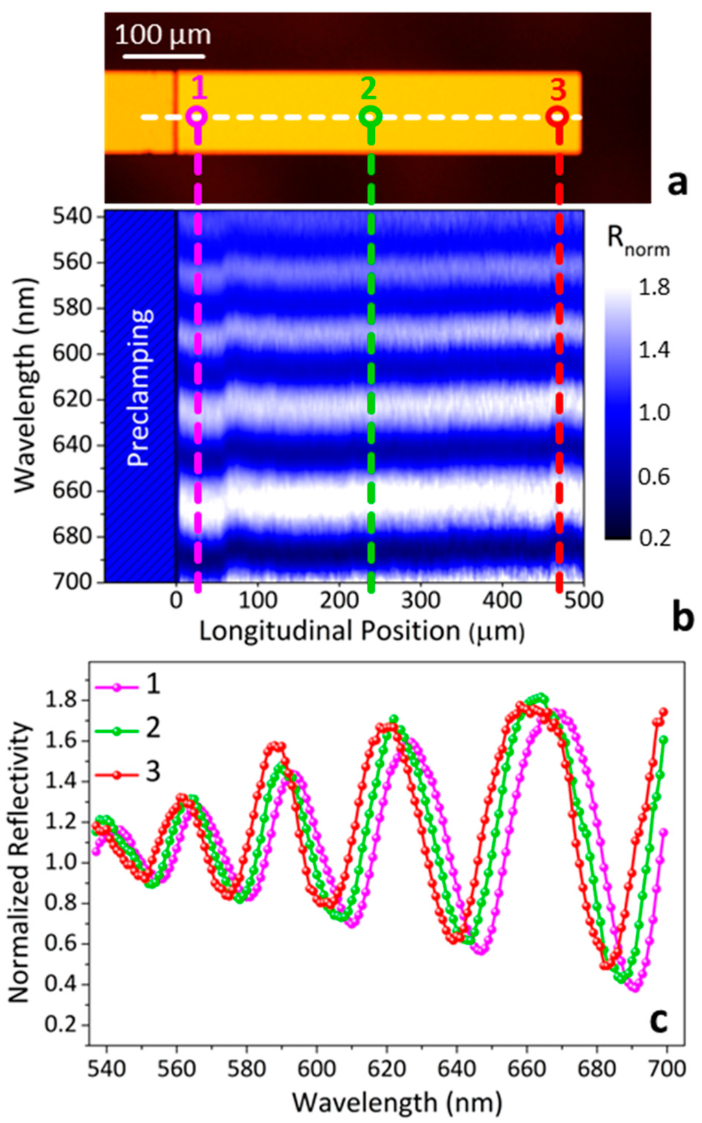 The color contour map of Figure 3b shows the wavelength-dependence of the normalized reflectivity measured along the cantilever longitudinal position (along the white dashed line drawn in Figure 3a). Each point measured along the cantilever exhibits a reflectivity modulation induced by Fabry–Perot interference. However, as highlighted by the vertical dashed lines of Figure 3b, the spectral positions of minima and maxima of reflectivity depend considerably on the position along the cantilever. This feature is more evident in Figure 3c, where the normalized reflectivity at three different cantilever positions is presented: near the clamping (point 1, magenta), at the middle (point 2, green) and close to the cantilever free end (point 3, red). The spectral shifts between the three reflectivity curves occur due to small cantilever thickness variations produced during the micro-fabrication process.