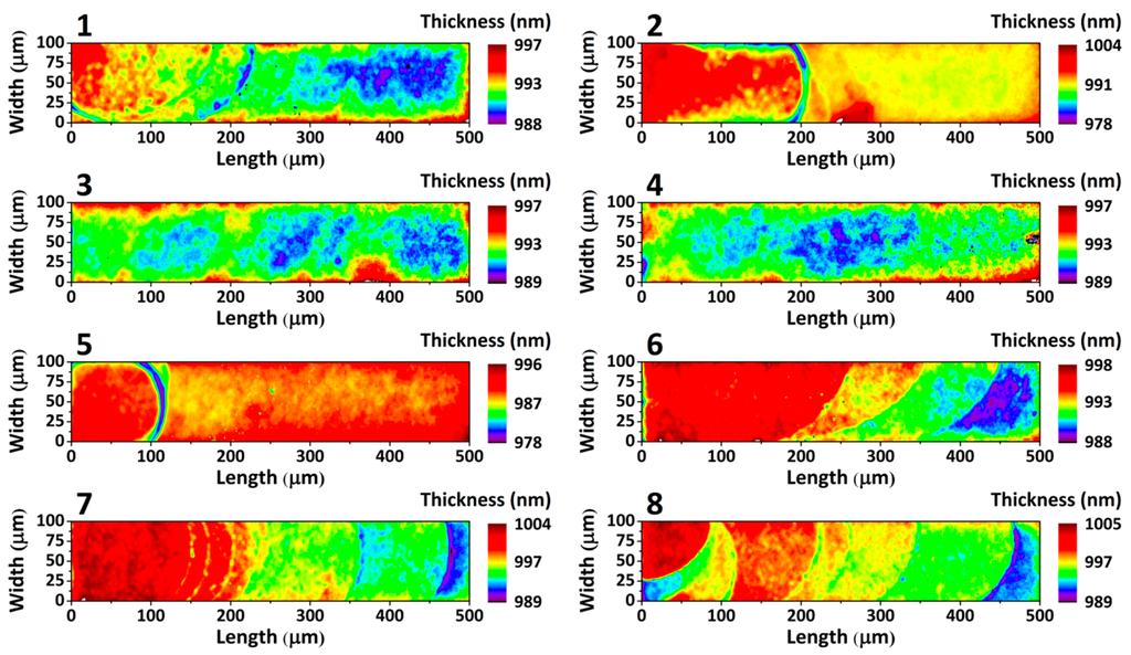 The thickness mapping of an entire array of eight cantilevers is shown in Figure 4; the cantilever nominal thickness provided by the manufacturer is 1000 nm and the colour bar scales represent the measured cantilevers thickness in nanometers. The thickness mapping of each cantilever was obtained from around 50,000 non-linear fittings with a goodness of fit [34] always higher than 0.99. The SMMS technique is able to distinguish thickness variations of 0.1%; this accuracy is given by the spectral accuracy of our experimental setup and the goodness of the fitting procedure, and it does not depend neither on the thickness nor the material that we have to analyse. As in our experiments, we characterized a 1 μm thick layer; here, the absolute thickness accuracy is about 1 nm. Thickness maps reveal significant discrepancies between different cantilevers placed in the same array. For example, cantilevers 3 and 4 present good thickness homogeneity, with a root mean square (RMS) thickness variation of about 1 nm along all the microstructure. In turn, cantilevers 2 and 7 show higher thickness heterogeneity, with a RMS thickness variation of 3.5 nm. It is noteworthy that the fabrication process produces cantilevers that are thicker in the vicinity of the clamping region, getting thinner near the free end.