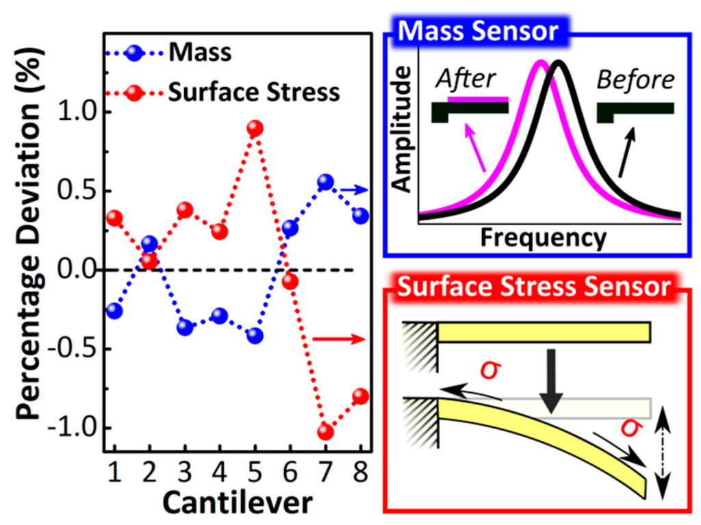 Percentage deviation of the mass and surface-stress sensitivities with respect to their average values for each of the eight measured cantilevers. (Top right blue box) Schematics of the effect of the mass loading on the resonance frequency of a cantilever; the resulting downshift of the resonance frequency is proportional to the added mass. Mass sensitivity was evaluated by calculating the resonance frequency shift produced by the addition of a uniform mass layer deposited on the top cantilever surface. (Bottom right red box) Schematics of the effect of the surface stress on the out-of-plane displacement of a cantilever; the cantilever displacement is proportional to the surface stress applied. Surface stress sensitivity was evaluated by calculating the displacement of the free cantilever end induced by a uniform and isotropic surface stress exerted on the upper cantilever surface.
