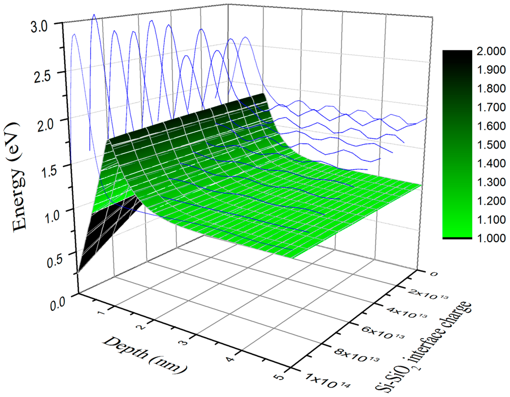 Three-dimensional plot of conduction band edge vs. depth and silicon-silicon oxide interface charge density for band structure engineered, 2D-doped BSI silicon array (shown for a delta-doped device). The figure shows that the placement of a high density of boron in a single atomic sheet creates a delta function change at the edge of the conduction band (green plot). The electron wave functions (shown in blue) are unconfined, illustrating that the placement of a delta layer within 1 nm of the surface reduces the probability of photoelectron trapping. The figure illustrates the stability of the 2D-doped surface against variable surface charge, which is associated with interface traps and radiation damaged surfaces.