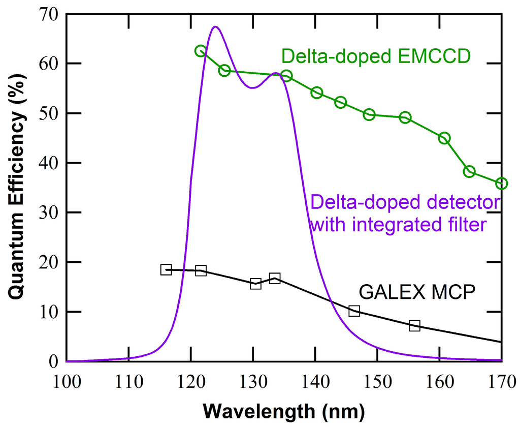 Silicon-based imaging detectors with single photon counting capability in the UV represents a significant leap forward in detector manufacturability, accessibility, and reliability. The enormous investment by industry and defense organizations has led to the development of large-format, high-resolution silicon imaging arrays. Relatively recent advances in solid-state imaging technology have produced detector architectures with high efficiency and built-in gain [13,14,15]. Challenges are posed, however, in producing silicon detectors with high UV sensitivity, stability with respect to illumination history, photon counting ability, and out-of-band rejection. Nanoscale surface and interface engineering technologies for surface passivation, together with progress in large-scale production, address these challenges and are leading to solid-state imagers being highly competitive and even superior in performance and cost to replace image-tube technologies in UV instrumentation [16,17,18].
