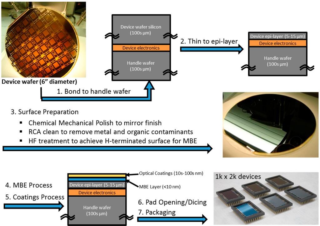 Process flow for end-to-end post fabrication processing along with schematic diagram of a superlattice-doped or delta-doped arrays (summarized as MBE layers), and the photographs of bare and AR-coated BSI silicon detector arrays. The coated arrays can be discerned from the reflective hue seen in photograph.