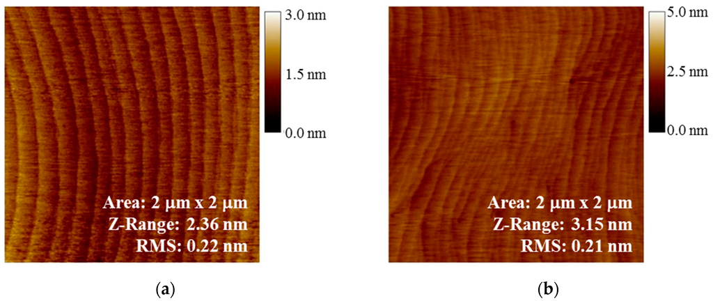 AFM images of MOCVD GaN grown on (a) HVPE GaN and (b) GaN template on sapphire showing high quality materials growth on the native substrate.