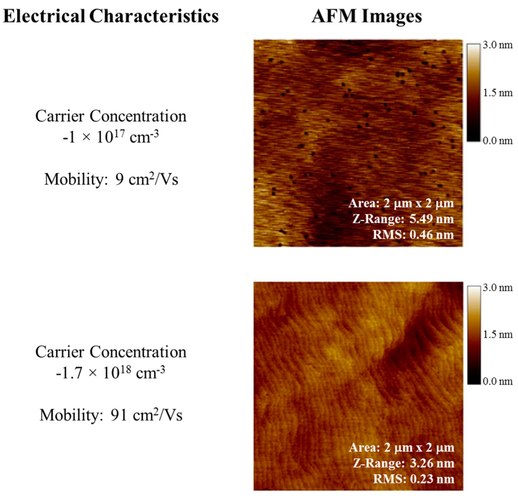 Pulsed growth in MOCVD shows marked improvement in the quality of AlGaN films as shown in the AFM images. The higher quality of both films is the result of the pulsed growth. Introduction of Si during the pulsed sequence is shown to greatly impact defect formation and density as well as carrier concentration. Si dopants were introduced during the Al pulse in the AFM image (top), whereas introduction of Si during the Ga pulse (bottom) increases both the free electron concentration as well as marked improvement in the quality of the AlGaN film.