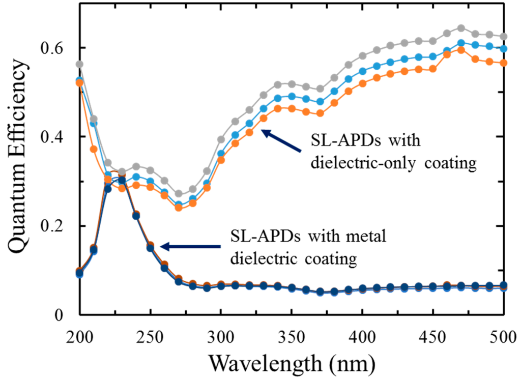 This section describes the results of superlattice-doped EMCCDs and APDs—with AR coatings and visible-blind filters followed by the results of the III-Nitride APDs.