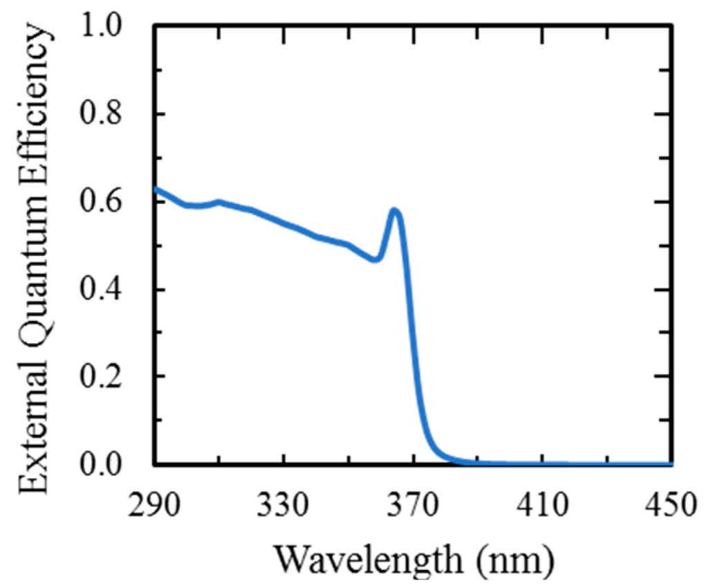 External QE as a function of photon wavelength for an Al2O3 –passivated GaN p-i-n APD with zero applied voltage. With no applied voltage, there is unity internal gain.