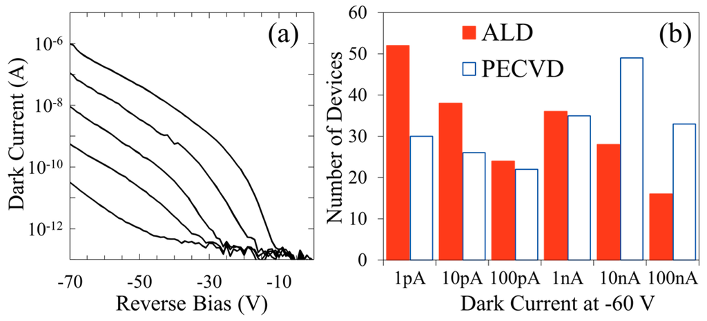 (a) Example of the variation in reverse bias behavior observed for ALD-passivated GaN APDs; (b) Histogram of ~200 devices with 25-μm diameter samples receiving a sidewall passivation layer of ALD Al2O3 or PECVD SiO2. First appeared in MRS Proceedings [50].
