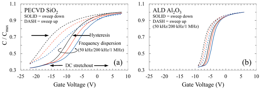 High-frequency CV characteristics for MOS capacitors fabricated on n-type GaN. A large reduction in the qualitative indicators of charge trapping—including voltage hysteresis, frequency dispersion, and stretchout—is observed for devices fabricated with (b) ALD Al2O3 compared to those with (a) PECVD SiO2.