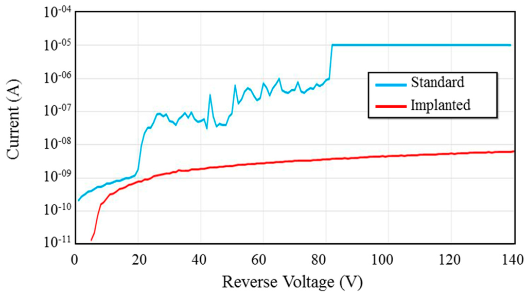 We have also shown that the high-field region around the top device contact is a significant source of avalanche dark current. One method for reducing this dark current component is ion implantation. Implantation around the contact perimeter creates high-resistance region that spreads the potential drop at the contact edge over a larger area, greatly reducing the electric field at the edges. It also creates a disordered region of heavy scattering that prevents electrons from acquiring the energy necessary for multiplication. This reduced field prevents premature breakdown at the contact edges. We have shown a large reduction in dark current and voltage-induced damage using this method (Figure 14) [51]. Innovative passivation methods using other materials can be explored to further reduce dark current in our APD devices.