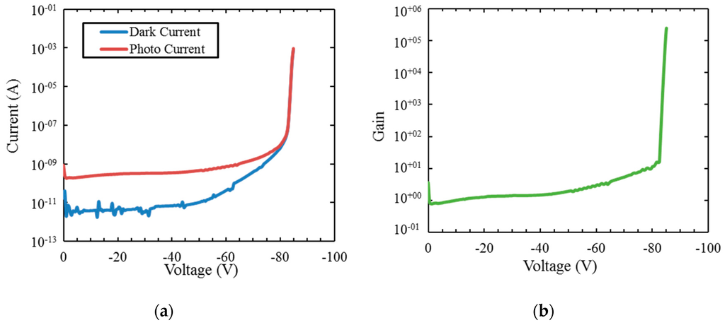 (a) Dark current (blue) and photocurrent (red) for a GaN p-i-n APD. (b) Gain derived from Figure 16a is shown in green. Avalanche gains of >105 have been measured on these devices.