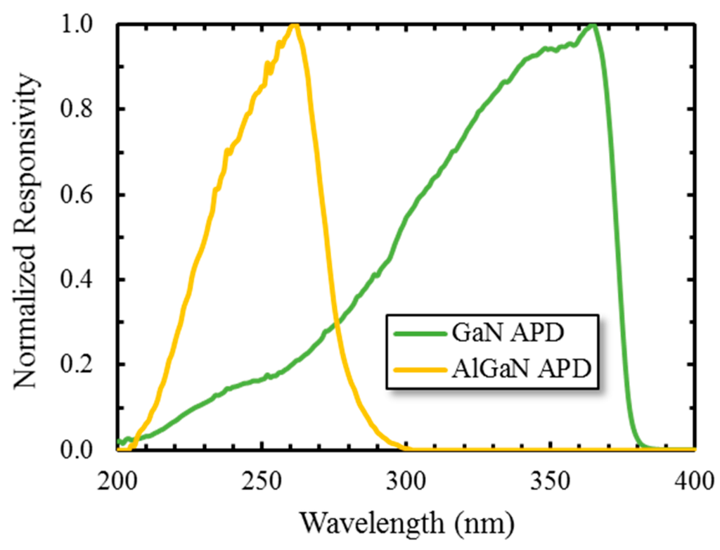 Comparison of the spectral response of GaN and Al.4Ga.6N APDs. First published in Journal of Electronic Materials [52].