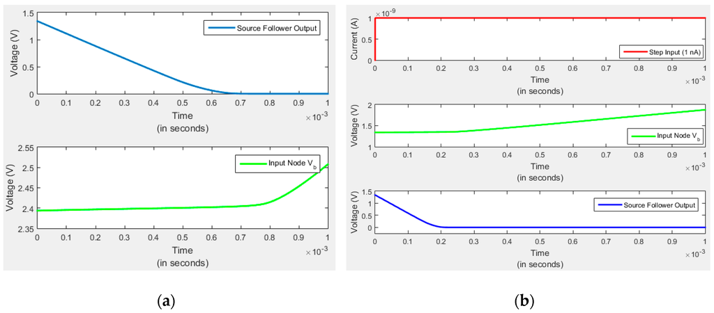 (a) As photodiode current starts to flow, the voltage at the node Vb rises from its initial value. As this occurs, the output voltage (source follower output) drops to 0. (b) A step response is simulated for a sudden increase in the input current from 0 to 1 nA. As soon as the input current rises to 1 nA, the output nodes settle to their steady state value without any ringing or overshoot.